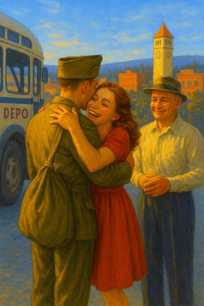 Paul watched through the windshield as the bus descended Sunset Hill and the buildings of Spokane came into view. Late afternoon summer solstice sunshine bathed the scene. They pulled into the depot, and he stepped down into the arms of his waiting sister. The two hugged unashamedly, something they had not done since they were children. Paul spotted his father over his sister’s shoulder. The two men shook hands around the clinging girl. “You’re looking mighty fine there, soldier,” Sam Harper beamed with uncommon emotion.