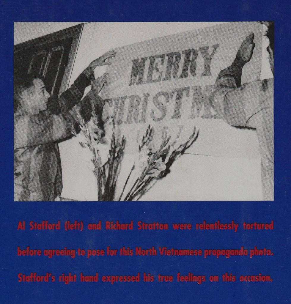 The next time I saw Al was ten years later on television. It was 29 January 1969. I was sitting comfortably in my suburban living room in San Jose, California, idly watching the evening news on NBC, when they showed a clip of two emaciated Vietnam POWs hanging a Merry Christmas sign on a wall. I did a double-take when I realized one was my old Sit, Sippin, and Singin Society buddy, Al Stafford. The other was Dick Stratton, whom I remembered from Chase Field in Texas. Until then, I had largely avoided all the controversy surrounding the war. I had put the military behind me and decided to let Johnson, McNamara, and the generals run the war. Suddenly, the war was right there in my living room. I was struck with a new understanding of why pundits were calling the Vietnam War “the living room war.”